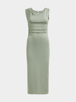 Get ready to turn heads in this stunning green bodycon dress. Featuring a draped design, and a gold metal shoulder detail. This dress is perfect for a night out or special occasion, dress it up with a pair of heels.