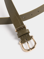 Elevate your outfit with our trendy olive green faux croc belt. Made from high-quality pleather, it adds a touch of sophistication to any look. Easy to style and comfortable to wear, this belt is the perfect accessory for any occasion. Stand out in style with this must-have piece!