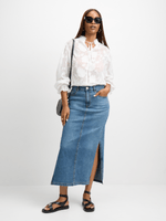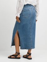 Elevate your style with our mid wash longer length denim skirt. Crafted with denim stretch fabric for a comfortable fit. Features side slits for a trendy touch, and convenient front and back pockets. Perfect for creating versatile and chic looks.