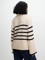 Stay cozy and stylish in our natural and black striped jersey from Exact. This jersey features side slit detailing, long flared sleeves, and a high neck design for added warmth. Pair with your favorite bottoms for a chic look.