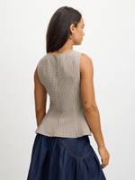 Elevate your style with our natural check peplum top from Exact. This top features a flattering peplum paneled design, and a convenient back zip for an easy fit. Perfect for any occasion, pair it with your favorite bottoms for a chic look.