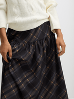 Elevate your winter wardrobe with our Exact navy checked skirt. This skirt features a stylish check pattern, basque silhouette, an elasticated waist, and maxi length. Pair with your favorite top for a chic look.