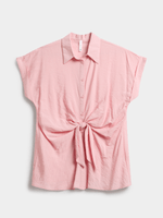 Elevate your style with our Exact pink front tie shirt. Made from rayon blend fabic, this shirt features a flattering tie front detail, button closure, and short sleeves. Perfect addition to your wardrobe.