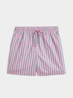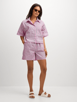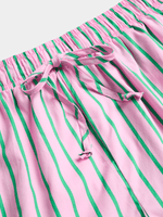 Get the perfect summer wardrobe with these pink and green striped pull-on shorts. Made from comfortable cotton poplin fabric, featuring an elasticated waist with drawstring and side pockets. These shorts have a relaxed fit perfect for any casual outing. Pair with your favorite top or the matching shirt for a laid-back look.