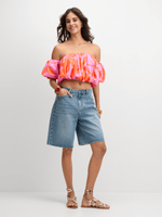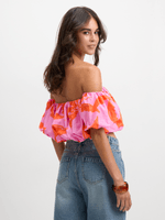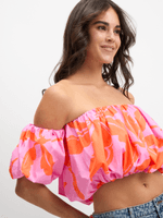 Introducing this Exact pink and orange poplin top for a vibrant wardrobe refresh. Features balloon sleeves, a must-have 2 tone tropical print, elasticated bust and hem and a flattering silhouette. It's perfect for those hot days. Pair it with your favourite bottoms.