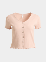 Stay classy and comfortable in this pink rib top. Made from cotton stretch ribbed fabric, featuring a button-through design and frill short sleeves, it's perfect for any occasion. Dress up or down effortlessly with this versatile piece.