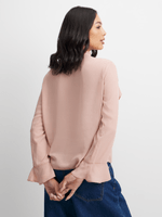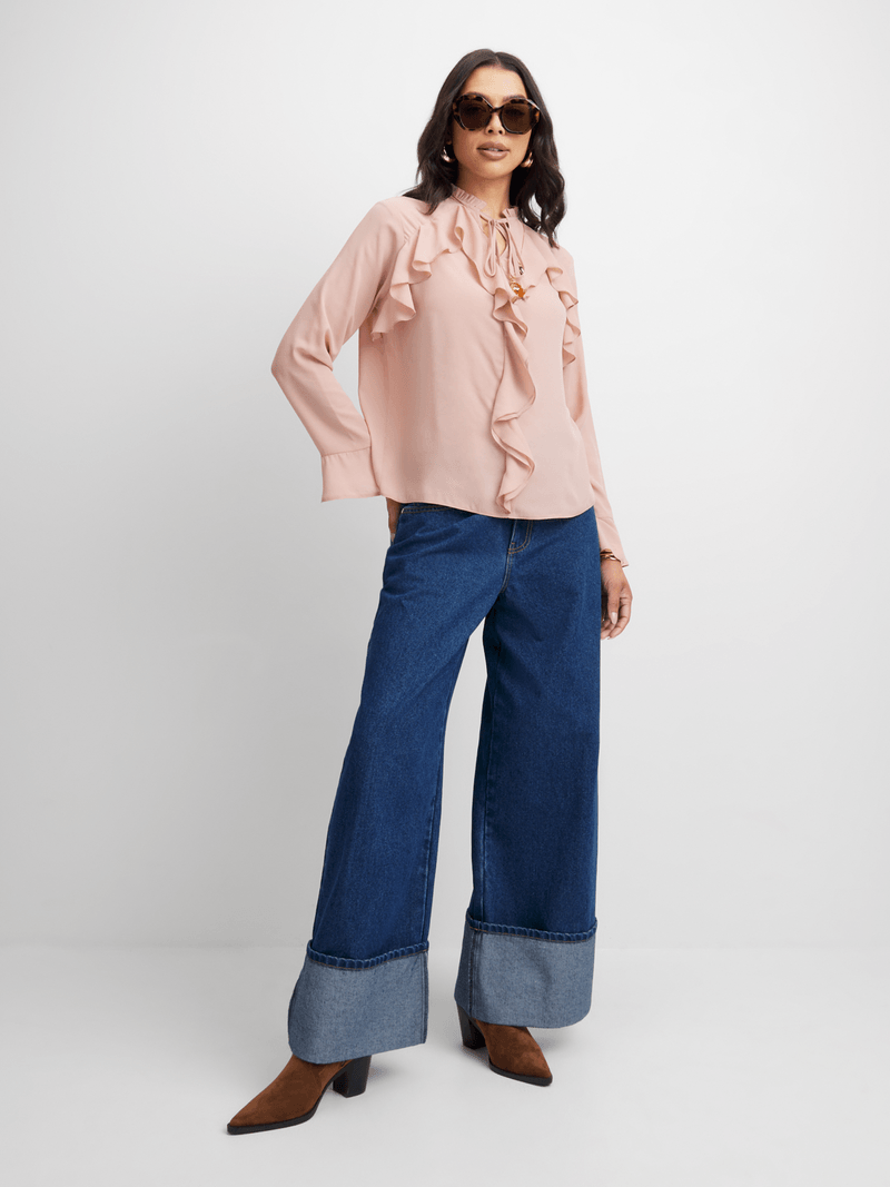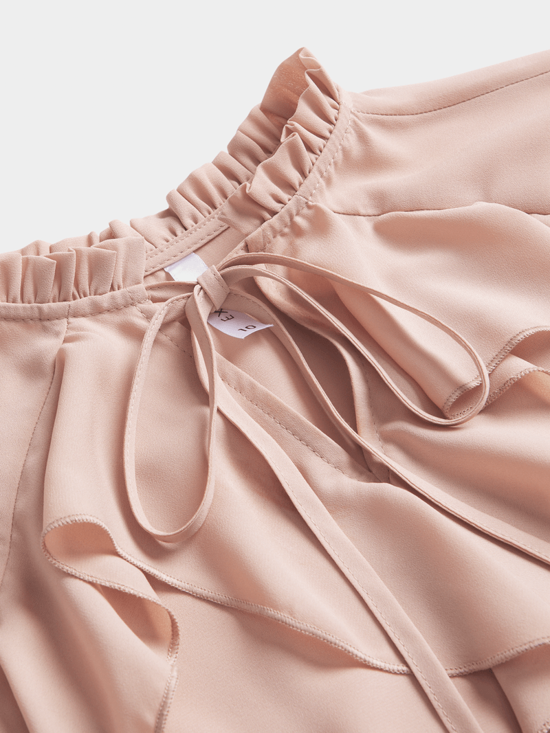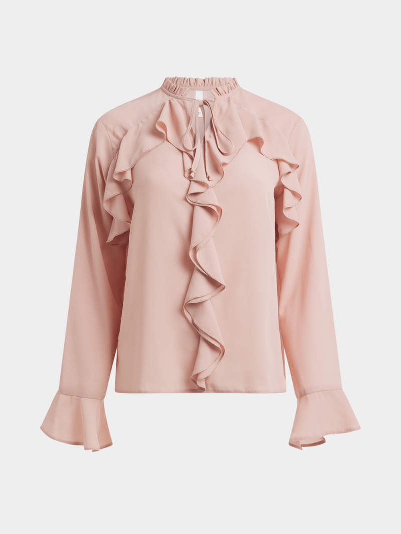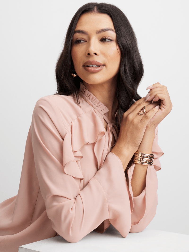 Elevate your look with our pink ruffle blouse. Designed with flutter sleeves, a chic neck tie and front ruffles for added flair. Versatile and perfect for any occasion, this blouse is a must-have staple in your closet.