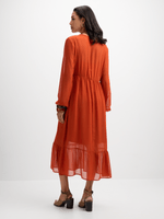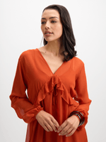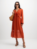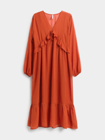 Introducing our stunning boho inspired rust maxi dress from Exact! Made from chiffon fabric, this dress features a flowy silhouette, ruffle details, balloon sleeves and a maxi length. This boho look is here to bring a soft and carefree vibe to your wardrobe.