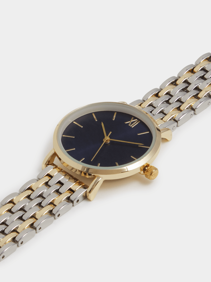 Make a statement with this round face metal link watch in silver and gold. This watch is a timeless accessory that adds a touch of sophistication to any outfit.