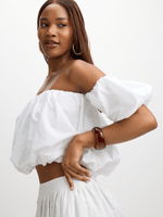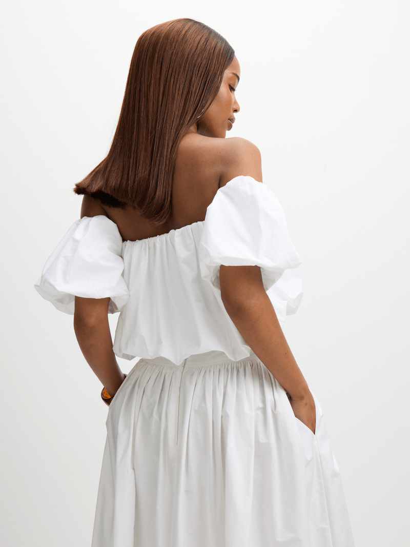 Introducing this Exact white poplin top for a vibrant wardrobe refresh. Features balloon sleeves, an elasticated bust and hem, and a flattering silhouette. It's perfect for those hot days. Pair it with the matching skirt or pants.