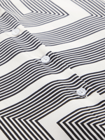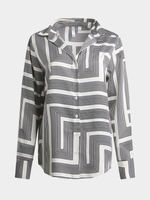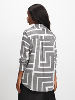 Elevate your wardrobe with our Exact geo print shirt. Made from a satin like fabric, this shirt features a black & white geo print. Perfect for any occasion, this shirt can be dressed up or down. Shop now and add a stylish touch to your look!