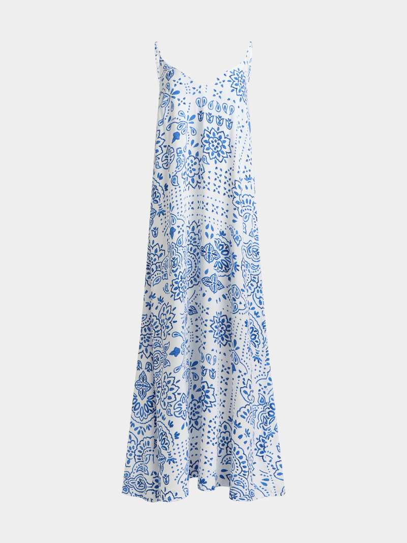 Elevate your style with this striking white and blue print dress from Exact! Made from viscose fabric, features a stunning tile print and flattering maxi silhouette that can be dressed up or down. This dress is ideal for all your sunny day adventures.