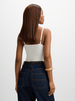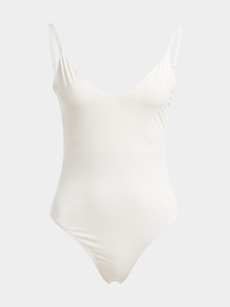 Elevate your outfit with this white bodysuit from Exact. This bodysuit is made from a soft touch fabric, with a sleeveless design and v-neckline for a chic look. Look and feel your best in this versatile and stylish wardrobe staple.