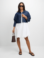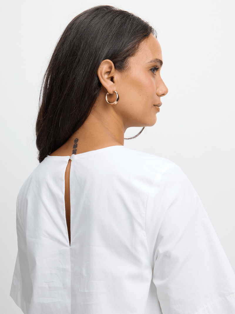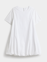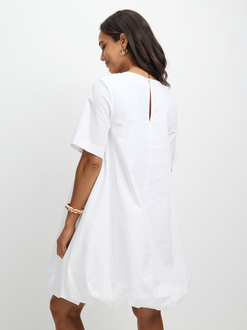Get ready to turn heads in our Exact women's white bubble mini dress. Made from 100% cotton poplin fabric, this dress features a fun balloon hem, short sleeves, and back keyhole detail. Pair it with your favorite accessories for a stylish look.