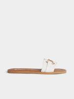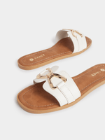 Step out in style with these sleek white sandals from Exact. Featuring a chic metal gold buckle and easy slip-on style, these sandals are a versatile addition to your wardrobe. Pair with dresses, shorts or skirts to step out in confidence this Summer.