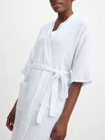 Feel free in our Exact white gown. Made from a lightweight textured 100% cotton fabric, this gown featres 2 side pockets, short sleeves, and a belted waist. Its the perfect mix of comfort and breathability for the Summer.