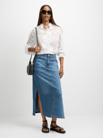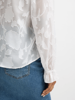 Introducing our eye-catching white floral blouse from Exact! Made from jacquard fabric with a burn out floral design, this blouse features a ruffle neck with tie detail and ruffled sleeve cuffs. Add a touch of chic to your wardrobe.
