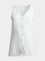 Stay stylish in our chic white long waistcoat. Made from linen look fabric, this waistcoat features a v-neck design and button up for a sophisticated touch. Dress it up or down with the matching pants. Look effortlessly chic with this versatile piece!