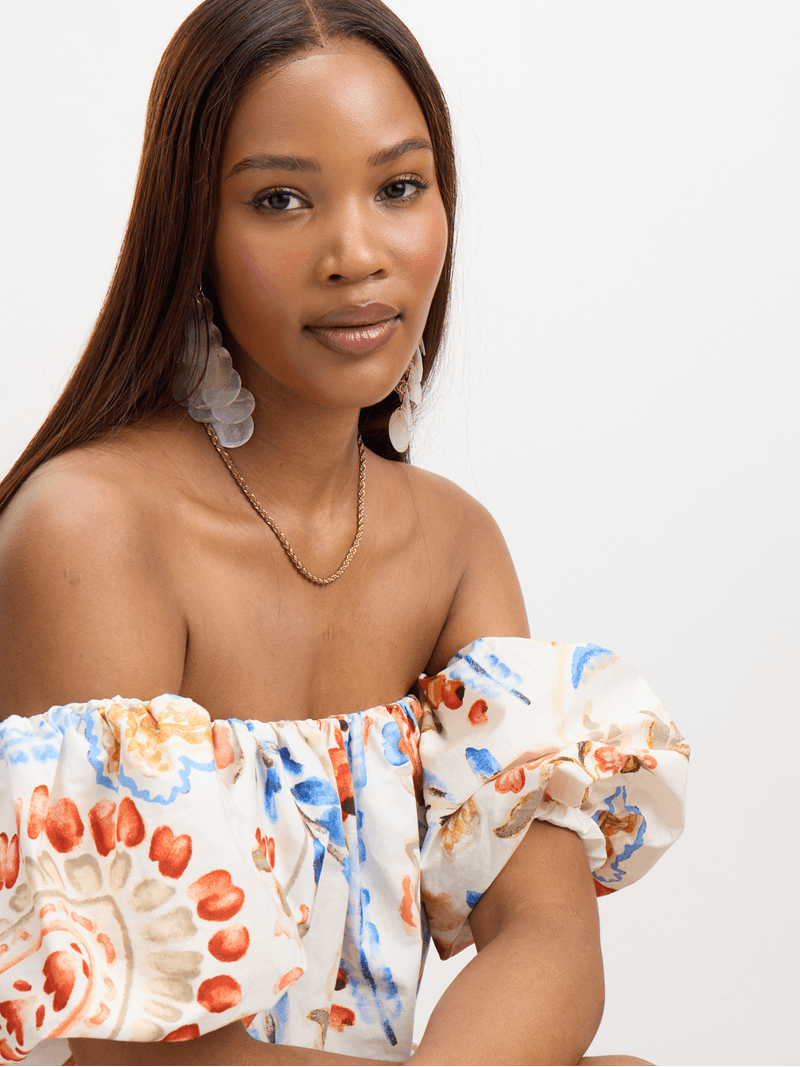 Elevate your wardrobe with our white paisley print balloon sleeve top. Made from soft cotton poplin, this top features a vibrant paisley print design, elasticated bust and hem and a flattering silhouette. It's perfect for those hot days. Pair it with the matching skirt.