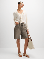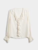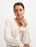 Elevate your look with our white ruffle blouse. Designed with flutter sleeves, a chic neck tie and front ruffles for added flair. Ruffles, sheers, and floaty silhouettes bring a touch of romance to every look. Versatile and perfect for any occasion, this blouse is a must-have staple in your closet.