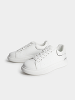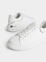 Step up your style game with these Exact white and silver sneakers. These flatform sneakers, featuring sleek silver detailing and white lace up are perfect for casual outfits.