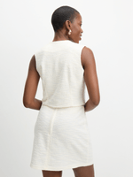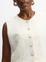 Elevate your look with our white textured waistcoat. Made from a boucle cotton blend fabric, this waistcoat features a textured design, front buttons and round neckline . Dress it up with the matching skirt for a polished look.