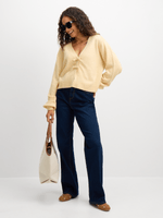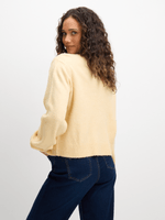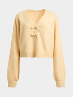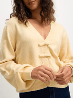 Stay cozy and stylish with our yellow bow cardigan from Exact. This cardigan features fun front bows, ribbed sleeve cuffs and hem and a trendy butter yellow colour. Perfect for layering, this cardigan is a must-have addition to your wardrobe.