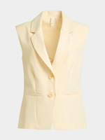 Elevate your outfit with our stylish butter yellow sleeveless blazer. Featuring 2 front pockets and front buttons. Easily dressed up or down, this blazer is perfect for any occasion. Pair it with the matching pants for a smart boardroom look we love.