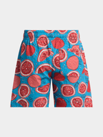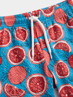 Get ready for some fun in the sun with these vibrant blue swim shorts featuring a cool orange print, 1 back pocket, and elasticated waist with drawstring. Perfect for beachy days.