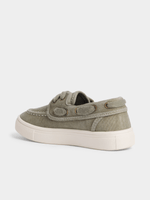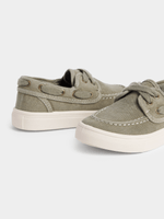 Match dad in these mini me fatigue boat shoes. These sneakers are comfy and durable. Featuring a white sole, stitching and lace details. Get your little one ready to step out in style!