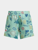 Get ready for some fun in the sun with these vibrant green swim shorts featuring a cool beach print, 1 back pocket, and and elasticated waist with drawstring. Perfect for beachy days.