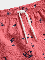 Get ready for some fun in the sun with these vibrant red swim shorts featuring a cool palm print, 1 back pocket, and elasticated waist with drawstring. Perfect for beachy days.