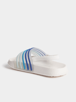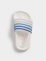 Get your little one ready for summer fun with these white and blue pool slides. Featuring a trendy striped upper and an elasticated ankle strap for comfort, these slides are a must-have for the sunny days ahead.
