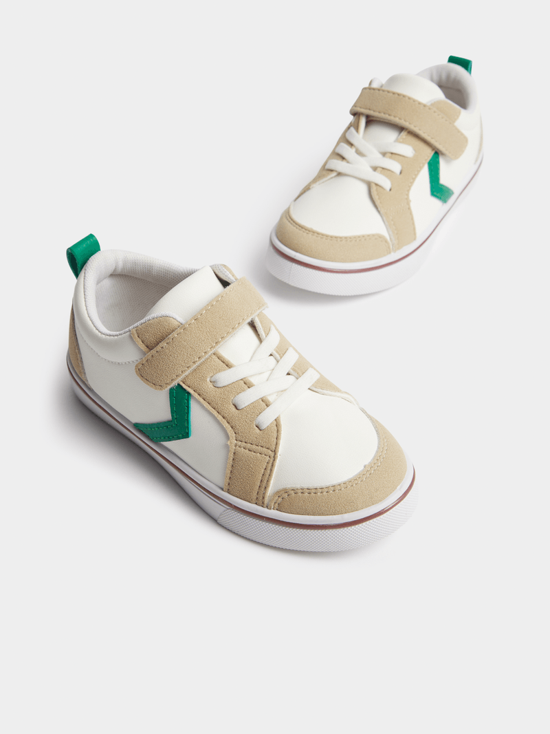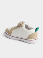 Get your little one ready to hit the playground in style with these white, natural, and green colourblock sneakers. Featuring a padded inner for comfort, as well as a velcro strap for an easy fit. Perfect for active little ones who want to stand out.
