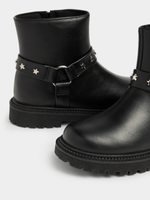 Get your little one ready to take on the day with these Exact black chelsea biker boots. Featuring buckles with silver star details, and a side zip for an easy fit Bring out her inner fashionista with these versatile boots.