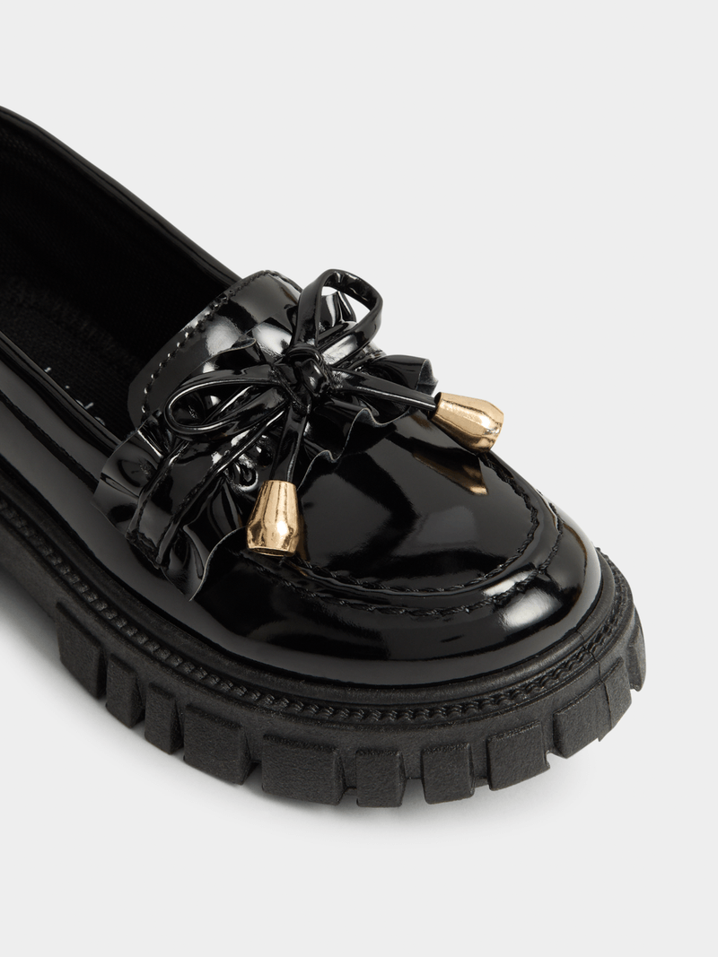 Step up her style game with these trendy black chunky loafers. Featuring a fun bow detail with gold accents, and a trendy chunky sole for comfort and style. These loafers are sure to become a favourite in her shoe collection.