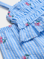 Get your little one ready for summer fun in this cute blue striped cami and pants set. Made from seersucker textured fabric, this set features a cherry print, smocked cami top and matching pants in a comfortable fit. It's perfect for playtime and tea parties.