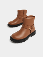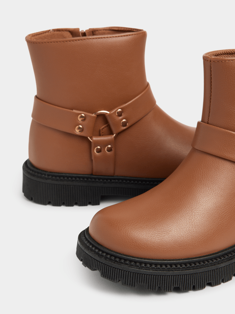 Get your little one ready to take on the day with these Exact brown chelsea biker boots. Featuring straps with gold metal details, and a side zip for an easy fit. Bring out her inner fashionista with these versatile boots.