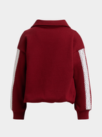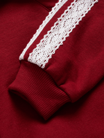 Stay cozy in style with our girl's burgundy sweat top. Made from cotton rich fleece fabric, features a trendy bubble hem design, johnny collar, and long sleeves with lace detailing. Ideal for mixing and matching with her favorite bottoms or the matching joggers.