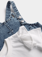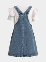 Get your little one ready for any occasion with this charming blue embroidered pinafore set. Crafted from denim cotton fabric, the pinafore features intricate embroidery details with front pockets and adjustable straps, and the t-shirt underneath has cute flutter sleeves. Keep your little one stylish and happy!