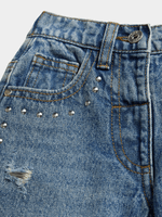 Get your little one ready to rock in our barrel leg jeans from Exact! Made from 100% cotton denim, featuring a mid-wash, 5 pockets, a half elasticated waistband, and studded detailing for a touch of edge. Keep your fashionista looking fresh.