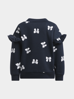 Stay cozy in this navy sweat top from Exact. Crafted from brushed fleece for ultimate comfort. Featuring a cute bow print, ruffle sleeve detail, ribbed crew neck, and hem. Pair with matching joggers for a casual look. Perfect for everyday wear.