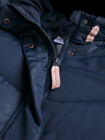 Stay warm and stylish in our Exact navy long puffer jacket. Featuring a cozy hood and longer length with side buttons for extra coverage and versatiliy. Perfect for chilly days, this jacket is a great addition to any wardrobe.