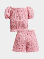 Get the young one ready for summer adventures with this cute pink anglaise top and shorts set. This set features anglaise fabric, a stylish top with bubble sleeves and an elastiacted hem, and shorts with an elasticated waist. Perfect for playdates or outings.