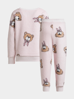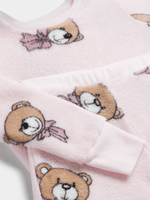 Unwind in style with this cozy sleepwear set, featuring soft coral fleece fabric for ultimate comfort. The teddy print top comes with ribbed cuffs and hem, while the teddy printed pants have a ribbed waist and hems. Perfect for lounging and dreaming.