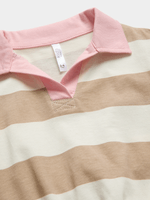 Get the little one ready for playtime with our white and natural striped polo top from Exact. Made from comfortable cotton single jersey fabric, this top features a johnny collar design, long sleeves, and ribbed cuffs and hem. Perfect for adding a pop of color to any outfit.