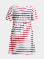 Get your little one ready for fun in the sun with this adorable white and red striped dress. Made with soft cotton, featuring an elasticated waist with side ties, a crew neck and short sleeves. It's perfect for playdates or parties.