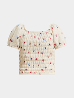 Get your little one ready for any occasion with this adorable white textured smocked top. Made from a textured fabric, this top features a cute cherry print and smocked design. Perfect for mixing and matching with other pieces or pair with the matching skirt.