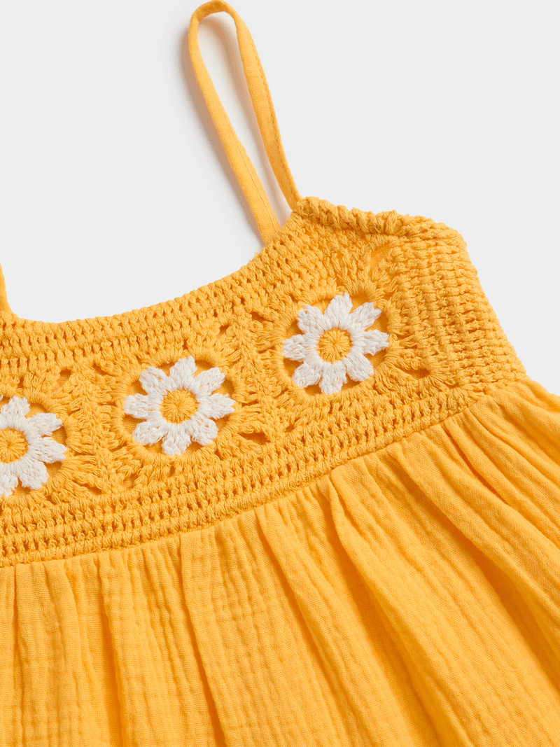 Get your little one ready for Summer with this adorable yellow crochet floral dress. Made from 100% cotton, it features a textured fabric and flower crochet design. Dress up your little one in this adorable piece and let her stand out in comfort and style.