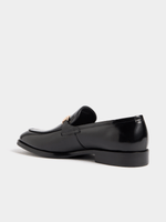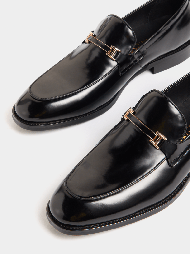 Step up your shoe game with the Fabiani black gloss leather gold plate loafer. Made from luxurious leather, this stylish loafer features a sleek gold plate for a touch of sophistication. Comfortable and durable, this versatile shoe is a must-have addition to your wardrobe. Treat yourself today!